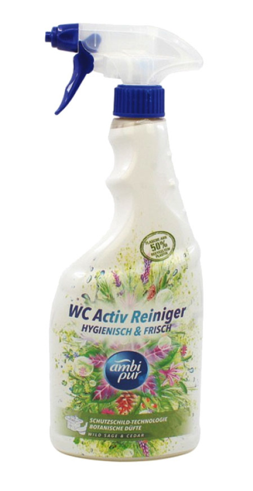 Ambi Pur WC Active Clean sprej 750 ml Wild Sage & Cedar je účinný čistič záchodové mísy. Díky účinnému složení perfektně odstraní nečistoty a bakterie z vaší toalety. Speciální technologie vytvoří na čištěném povrchu orchranný povlak, který ochrání toaletu před dalším znečištěním. Navíc odstraní zápach a provoní vaši koupelnu vůní divoké šalvěje a cedru.