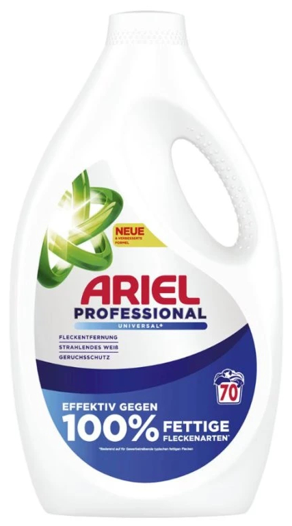 Ariel Professional Universal prací gel 3,15 l je vysoce koncentrovaný tekutý prací prostředek, který poskytuje dokonalou čistotu a odstranění skvrn již při prvním praní. Je vhodný pro bílé i stálobarevné prádlo a účinný už při nízkých teplotách od 20 °C.