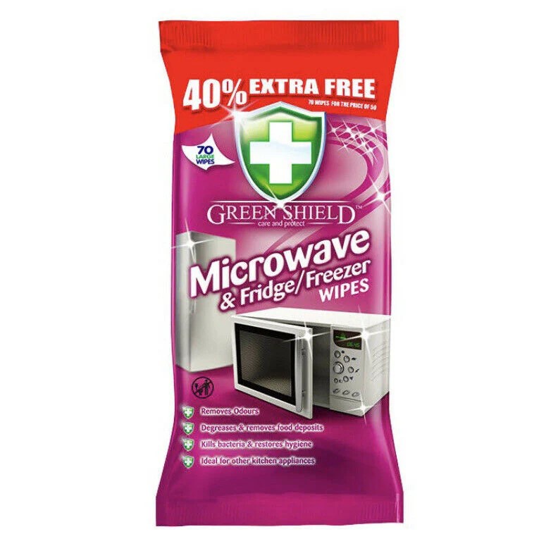 Green Shield čístící ubrousky na mikrovlnku - 70Ks speciální čistící ubrousky na mikrovlnku, které si poradí i se zaschlými zbytky a mastnotou. Ubrousky jsou lehce abrazivní a tak dobře sundávají nečistoty. Navíc jsou vhodné přímo na použití v mikrovlných troubách a nezanechávají v mikrovlnce zbytečné chemikálie. V případě, že je Vaše mikrovlnná trouba silně znečištěná, tak doporučujeme nejprve nechat v troubě na 2-5 minut misku s vodou a citrónem nebo kyselinou citronovou a zapnout plný výkon. Nečistoty se tak napaří a ubrouskem je velmi snadno sundáte. Balení 70Ks ubrousků.