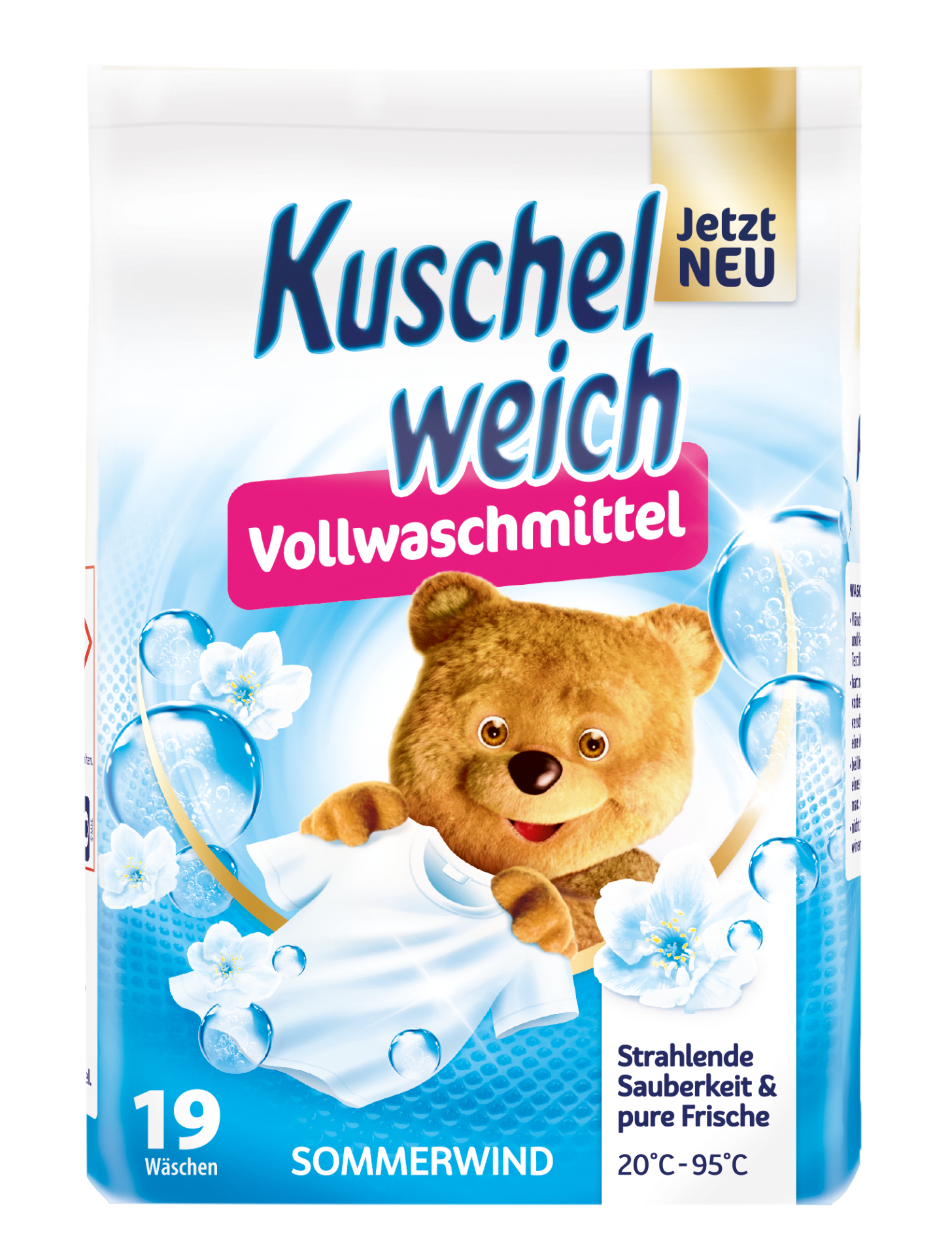 Kuschelweich prací prášek 19 dávek Universal Sommerwind 1,216 kg je prací prášek pro měkké prádlo. Zářivá čistota a čistá svěžest. S aktivní schopností odstraňovat skvrny od teploty praní 20 °C. Vhodný pro vaše bílé a stálobarevné prádlo, je obzvláště šetrný k vláknům a okouzlí vás nebeskou plyšovou jemnou letní vůní větru.