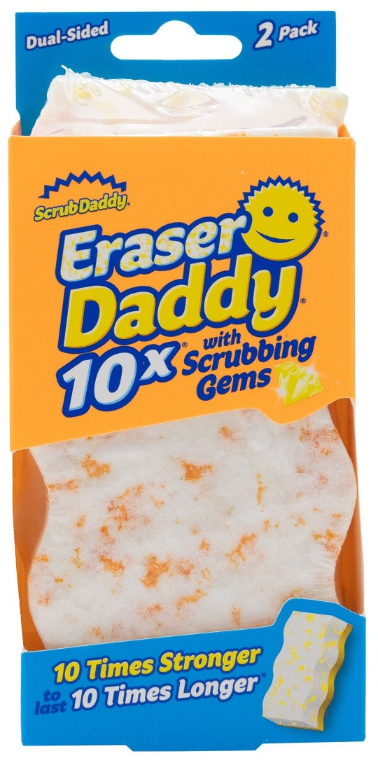 Eraser Daddy jsou extra silné čisticí houbičky, které se aktivují vodou a poradí si s nečistotami, skvrnami i šmouhami, na které běžné houbičky nestačí. Kombinují exkluzivní materiál Power Erase, který je 10x odolnější než tradiční melaminové houbičky s vrstvou FlexTexture®, která pomáhá uvolnit nečistoty. To znamená, že si poradí i s těmi nejodolnějšími skvrnami, jako jsou skvrny od fixů a tužek na stěnách a nábytku, usazeniny vodního kamene v koupelně, zaschlá mastnota na kuchyňských skříňkách, šmouhy na botách a mnoho dalších. Balení obsahuje 2 ks houbiček.