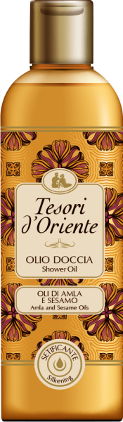Tesori d'Oriente Olio Doccia Oli di Amla e Sesamo sprchový olej s jemnou olejovou texturou se při kontaktu s vodou promění v bohatou a hedvábnou pěnu. Jemně smývá nečistoty a maz a zanechává pokožku hedvábně hladkou. Dopřejte sobě nebo někomu blízkému tělovou péči od značky Tesori.