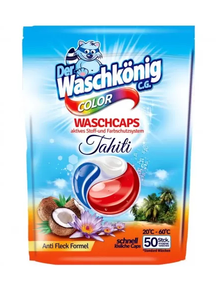 Limitovaná verze inovativních kapslí Der Waschkönig Universal TAHITI je vhodná pro barevné tkaniny. Díky třem komorám se speciálním složením enzymů jedna kapsle důkladně odstraní všechny druhy skvrn a nečistot. Organický a veganský produkt. Vyznačuje se intenzivní vůní tropického ovoce. Navíc ve velkém balení 50 kapslí.