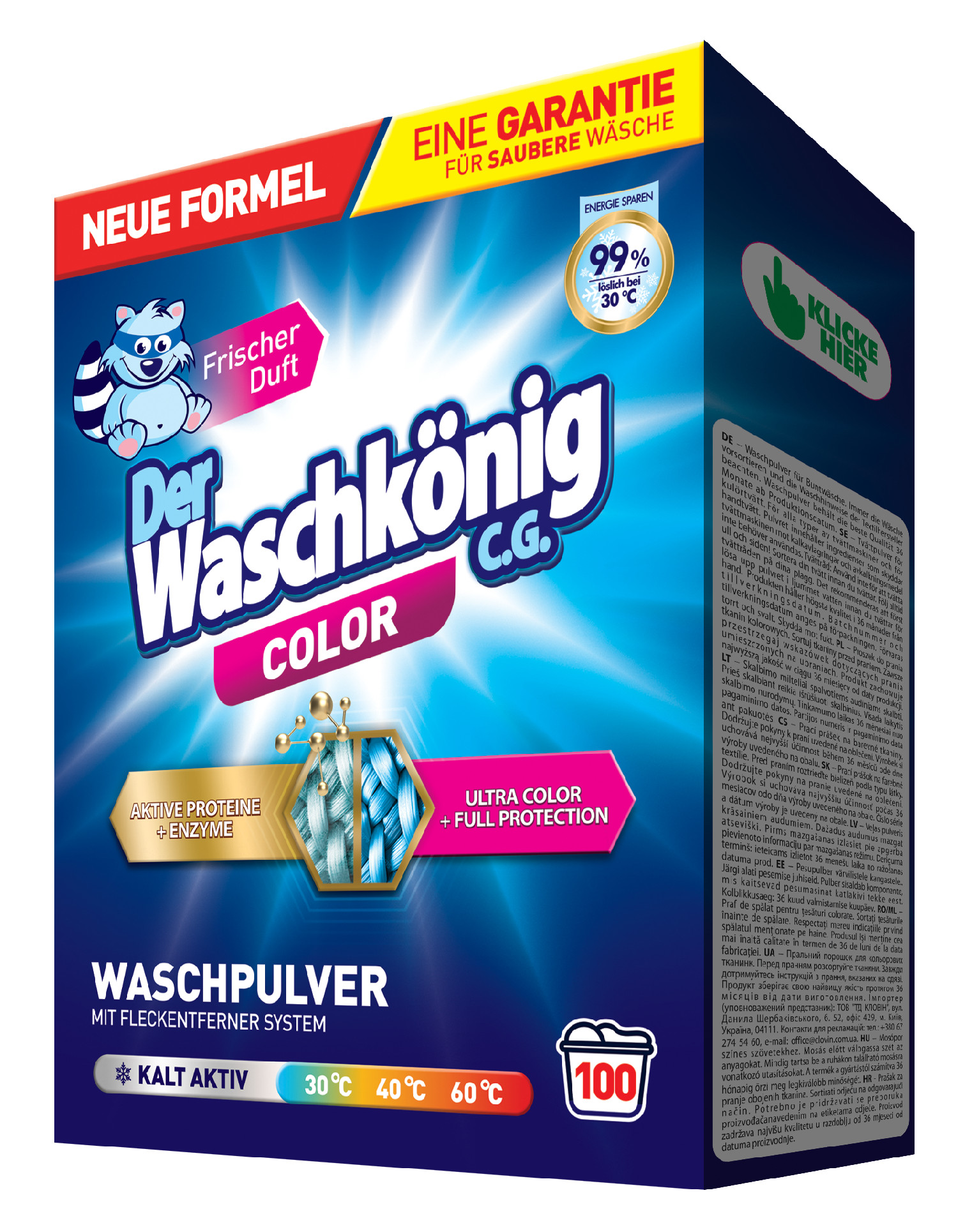 | Waschkönig Color je prací prášek určený pro praní barevného prádla s výbornými pracími výsledky především v odstraňování skvrn a obnovy původní barvy. Německý prací prášek s intenzivní a svěží vůní určený pro barevného prádla s výbornými pracími výsledky především v odstraňování skvrn. Koncentrát. Teplotní prací rozsah: 30, 40, 60, 95 ºC Intenzivní a svěží vůně Ochraňuje pračku před usazováním vodního kamene Velmi snadno rozpustný ve vodě |