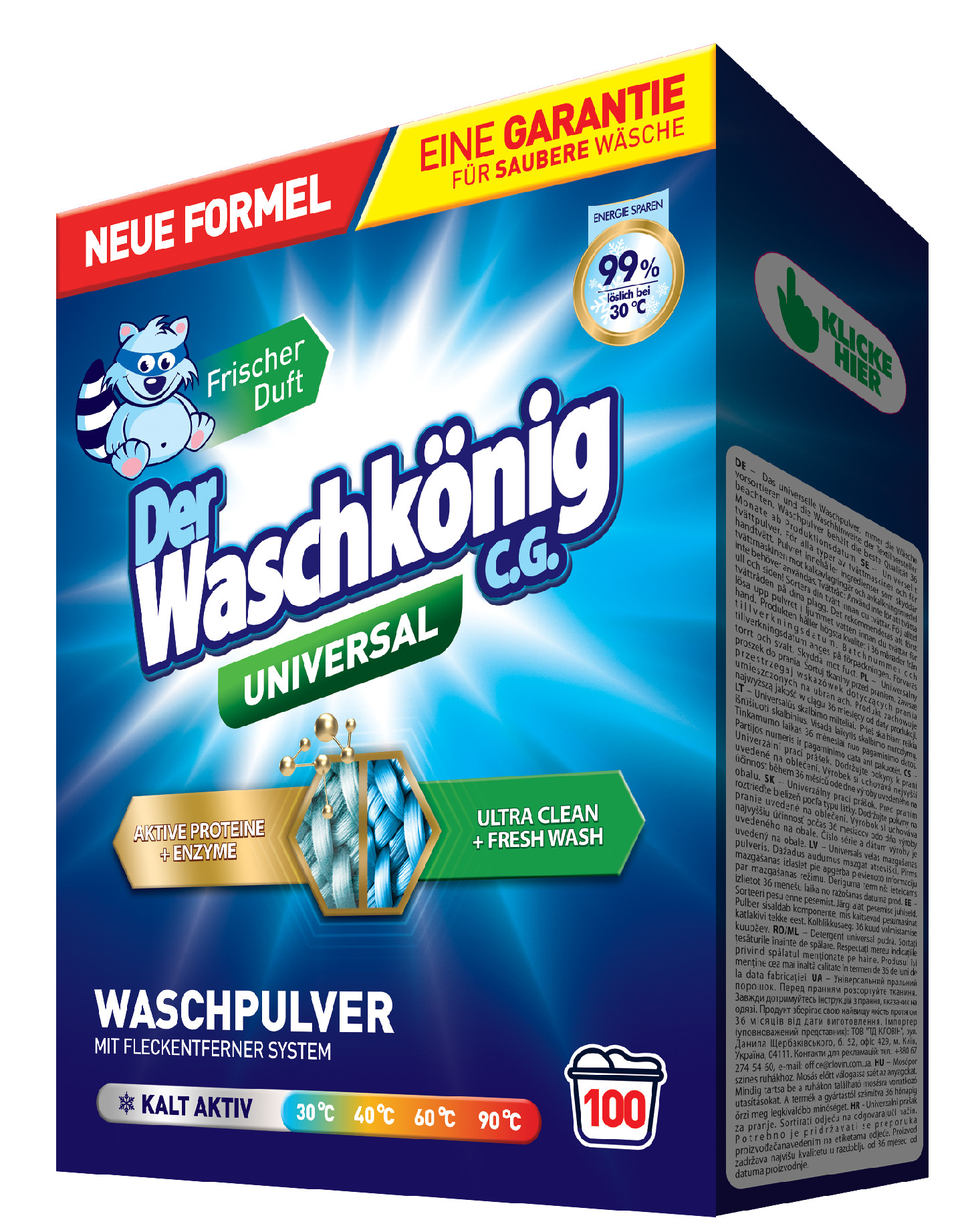 | Waschkönig Universal je prací prášek určený pro praní bílého a stálo barevného prádla s výbornými pracími výsledky především v odstraňování skvrn a obnovy původní barvy. Německý prací prášek s intenzivní a svěží vůní určený pro praní bílého a stálo barevného prádla s výbornými pracími výsledky především v odstraňování skvrn. Koncentrát. Teplotní prací rozsah: 30, 40, 60, 95 ºC Intenzivní a svěží vůně Ochraňuje pračku před usazováním vodního kamene Velmi snadno rozpustný ve vodě |